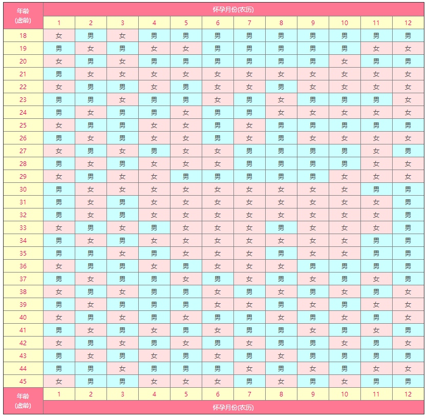 古代的清宫表由两部分构成,横坐标为怀孕月份,从农历1月到12月(记住是农历)。纵坐标为年龄,从18岁到45岁,在这里要注意女性年龄是以农历虚岁(即真实年龄+1岁),横坐标和纵坐标交叉的坐标点就是生男生女的测试结果。由于古代人是没有排卵期这个概念的,所以怀孕的日期一般预估都是在最后一次来月经的时间。