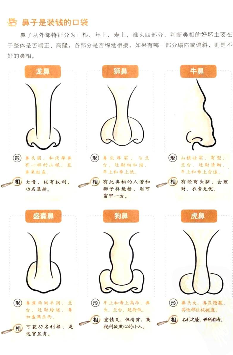 五官中的鼻子是从外部特征区分:山根、年上、寿上、准头这四个部分的,判断鼻相的好坏主要在于整体是否端正,高隆,各部分是否延绵相接,如果有哪一部分塌陷或者偏斜,则是不好的鼻相。