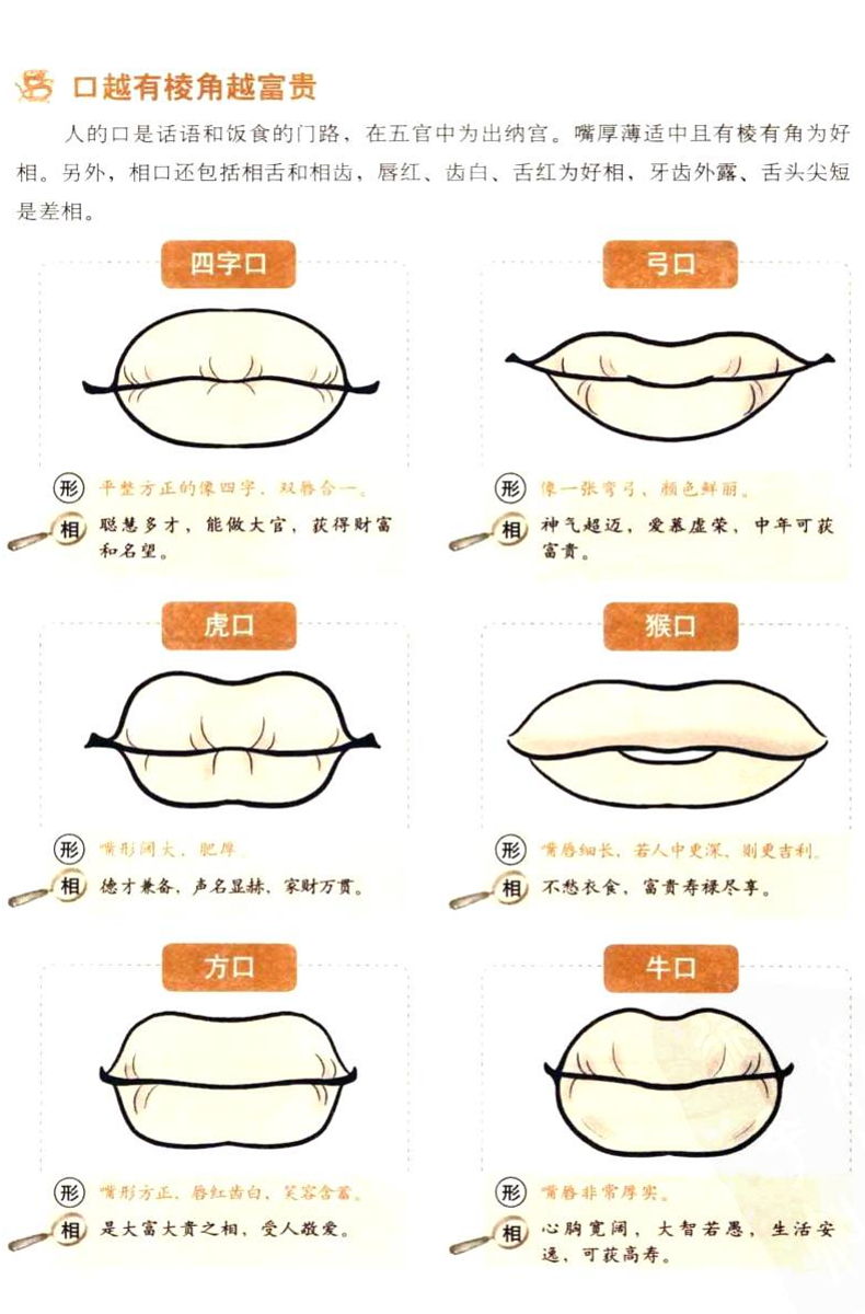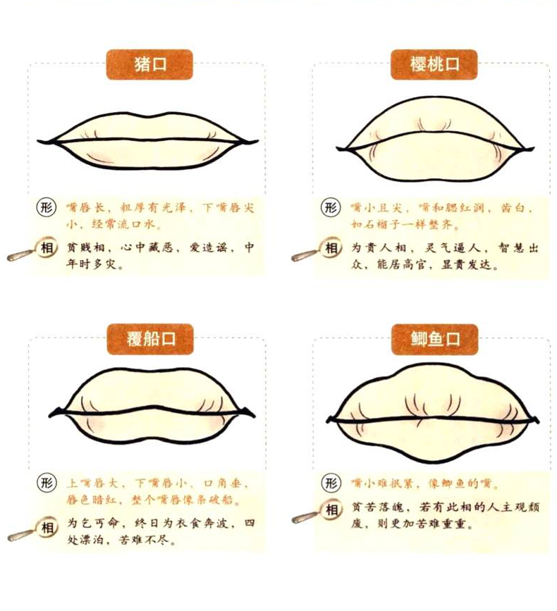 人的嘴部是言语和饭食的门路。在五宫中口为出纳官,嘴厚薄适中且有棱有角为好相。相口型嘴部包括相舌和相齿。唇红、齿白、舌红为好相,牙齿外露、舌头尖短则是差相。我们按照古代总结的嘴型分享一些图例,希望能够帮助到到家,当然如果按照一个人命理和运势的话,还需结合其他部位一同分析,才可得到更为准确答案。