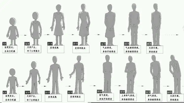 今天我们要说的就是关于男性和女性在生命周期中的一些不同点,我们都知道男性和女性由于生理构造的不同,会有一些差异,古人在总结中医学中做了一些归纳。中医学把男女的生长周期做出一个女七男八的总结,我们来看一看古人是如何看待男女的不同规律。