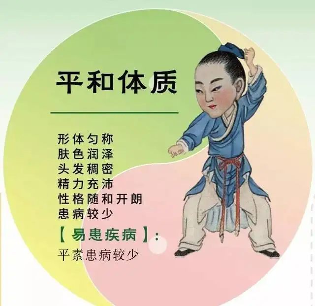 阴阳平和质的人,其特征表现为:身体强壮,胖瘦适度。面色与肤色虽有颜色的偏差,但都明润含蓄。食量适中,两便通调。舌头红润,脉象缓匀有神。目光有神,性格开朗、随和。夜眠安和,精力充沛,反应灵活,思维敏捷,工作潜力大。自身调节和对外适应能力都强,具有这种体质特征的人,不易感受外邪,很少生病,只要各种养生方法调养得宜,没有不良生活习惯和嗜好,不受暴力外伤,其体质不易改变,容易获得长寿。