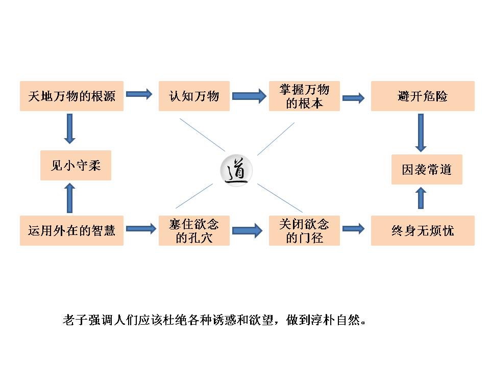 天地万物本身都有起始,这个始作为天地万物的根源。如果能知晓根源,就能认知万物,如果认知了万物,又掌握了万物的根本,那么终生就没有危险。塞住欲念的孔,关闭欲念的大门,终身就不会有烦扰的事。如果开启欲念之孔,就会增添烦恼的事情,终身都不可救治。能够观察入微,叫做明,能够持守柔弱,叫做强。运用其光芒,返照内在的明,不会给自己留下祸患,这就是因袭自然之道。