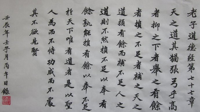 自然的规律,不是很像张弓射箭吗?弓弦拉高了就把它压低一些,拉低了就把它举高一些,拉得过满了就把它放松一些,拉得不足了就把它补充一些。自然的规律,是减少有余的补给不足的。可是社会的法则却不是这样,要减少不足的,却用来奉献给有余的人。那么,谁能够减少有余的人,以补给天下人不足的人呢?只有有道的人才可以做到。因此,有道的圣人这才有所作为而不占有,有所成就而不居功。他是不愿意显示出自己的贤能。