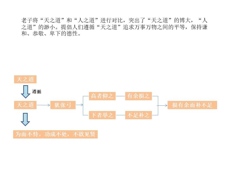 在这里,老子将“天之道”和“人之道”进行对比,突出了“天之道”的博大,“人之道”的渺小。提倡人们遵循“天之道”追求万事万物之间的平等,保持谦和、恭敬、卑下的德性。