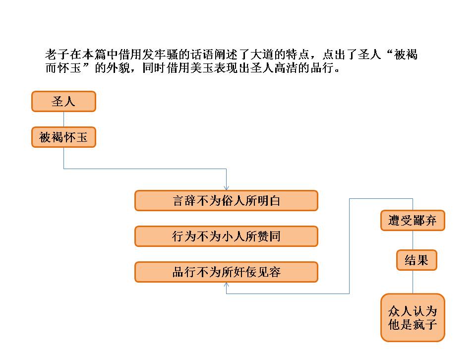 在这里,老子借用了发牢骚的话语阐述了大道的特点,从而引申出了圣人那种“被褐怀玉”的外貌特点,同时也以此来表现圣人的高洁品行。犹如古代的屈原,几经放逐后,对楚国的统治者失去希望,发出“举世皆浊我独清,众人皆醉我独醒”的悲鸣,最后投江而亡。显示出其不愿意同流合污的高尚行为。