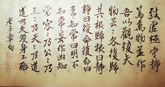 尽力使心灵达到虚无的极端境界,使生活清静坚守不变。在万物生长一齐蓬勃生长发展中,我利用虚静的境界考察气发展变化的规律。那万物纷纷芸芸,各自返回它的初始状态。返回到它的初始状态就叫做清静,清静就叫做天道所归的命。恢复其生命历程是宇宙的永恒法则,认识了宇宙的永恒法则就叫做明智,不明白宇宙的永恒法则的轻妄举止,往往会招来灾难。认识宇宙永恒法则就能包容一切,包容一切就会坦然公正,坦然公正就可以为天下君主,天下君主应合天理法则,而天理法则必须符合“道”,符合“道”就能够长久存在,终生没有危险。