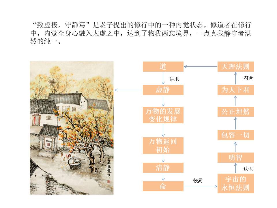 在这里,“致虚极,守静笃”是老子提出的修行中的一种内觉状态。修道者在修行中,内觉全身心融入太虚之中,达到了物我两忘境界,并非茫然一片,一点真我静守者湛然的纯一。