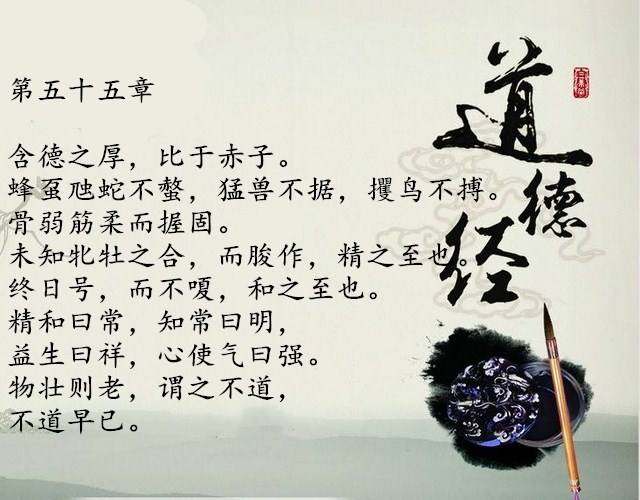 道德涵养浑厚的人,就好比初生的婴孩。毒虫不螫他,猛兽不伤害他,凶恶的鸟不搏击他。他的筋骨柔弱,但拳头却握得很牢固。他虽然不知道男女的交合之事,但他的小生殖器却勃然举起,这是因为精气充沛的缘故。他整天啼哭,但嗓子却不会沙哑,这是因为和气纯厚的缘故。认识淳和的道理叫做“常”,知道“常”的叫做“明”。贪生纵欲就会遭殃,欲念主使精气就叫做逞强。事物过于壮盛了就会变衰老,这就叫不合于“道”,不遵守常道就会很快地死亡。