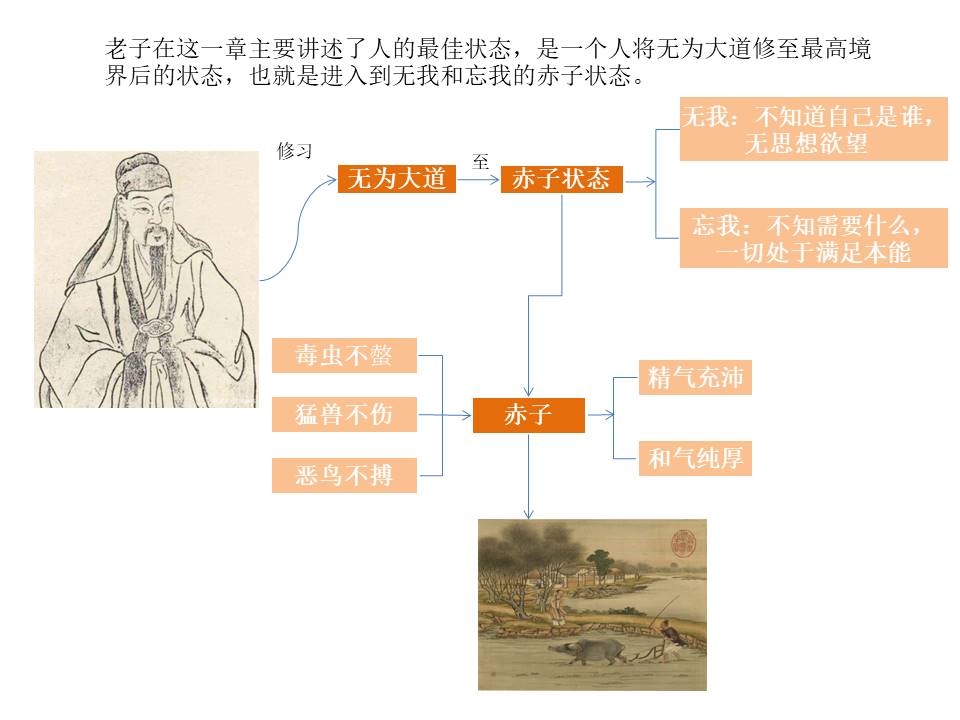 老子在这里主要讲述了人的最佳状态,是一个人将无为大道修至最高境界后的状态,也就是进入到无我和忘我的赤子状态。同时,他还提出了“物极必反”的理论,告诫人们做任何事都要把持一个度。