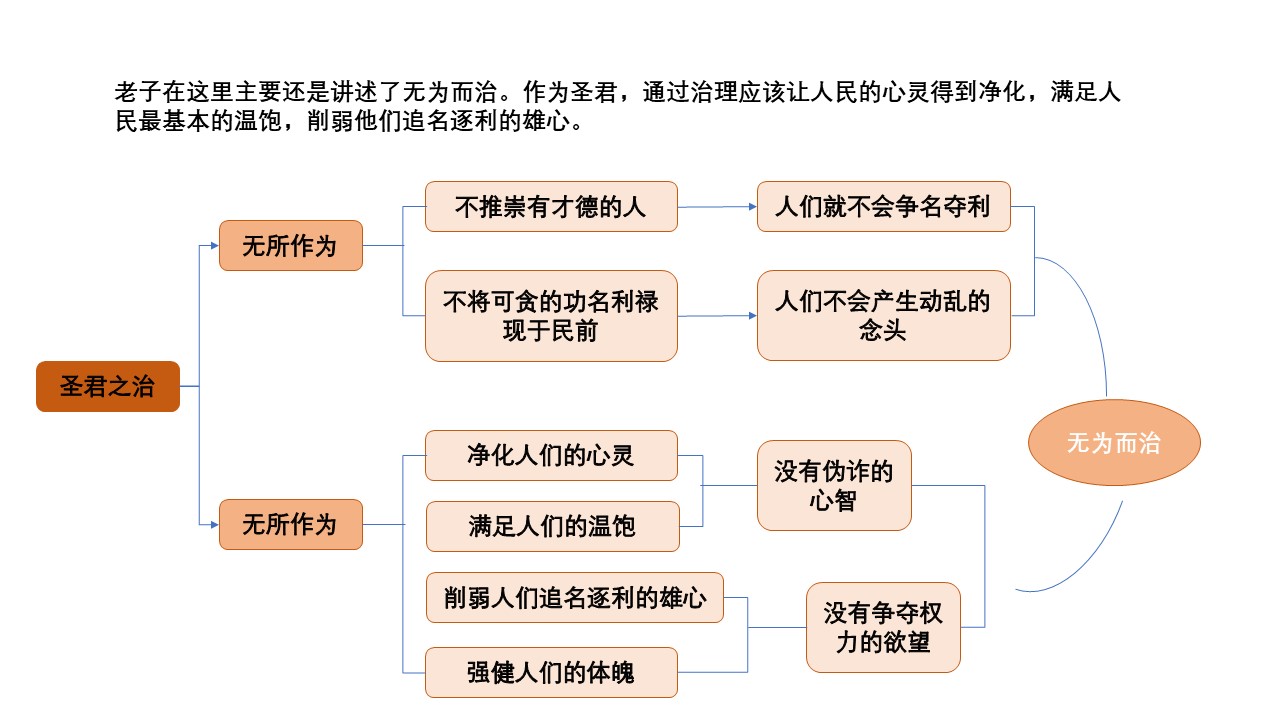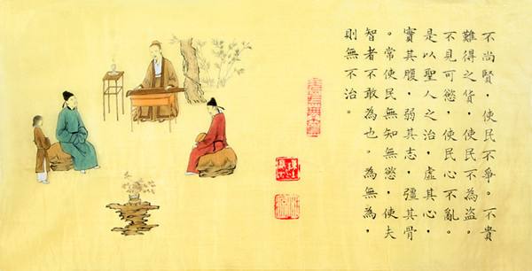 不推崇有才德的人,使百姓不相互争夺;不珍爱难得的财物,使百姓不去偷窃;不显耀足以引起贪心的事物,使民心不被迷乱。因此,圣人的治理原则是:排空百姓的心机,填饱百姓的肚腹,减弱百姓的竞争意图,增强百姓的筋骨体魄,使百姓没有智巧,没有欲望。致使那些有才智的人也不敢妄为造事。圣人按照“无为”的原则去做,办事顺应自然,那么,天下就不会不太平了。