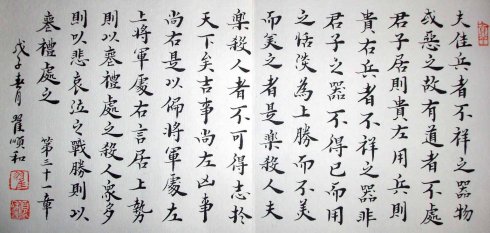 兵器啊,是不祥的东西,人们都厌恶它,所以有“道”的人不使用它。君子平时居处就以左边为贵,而用兵打仗时就以右边为贵。兵器这个不祥的东西,不是君子所使用的东西,万不得已而使用它,最好淡然处之,胜利了也不要自鸣得意,如果自以为了不起,那就是喜欢杀人。凡是喜欢杀人的人,就不可能得志于天下。吉庆的事情以左边为上,凶丧的事情以右方为上,偏将军居于左边,上将军居于右边,这就是说要以丧礼仪式来处理用兵打仗的事情。战争中杀人众多,要用哀痛的心情参加,打了胜仗,也要以丧礼的仪式去对待战死的人。