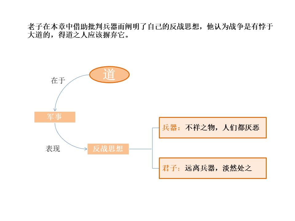 老子反对战争,在这里,他对兵器进行了犀利的批判,认为兵器是不祥之物。他把对兵器的看法融入了自己高深的哲理之中,认为战争是有悖于大道的,是得道之人应该摒弃的。