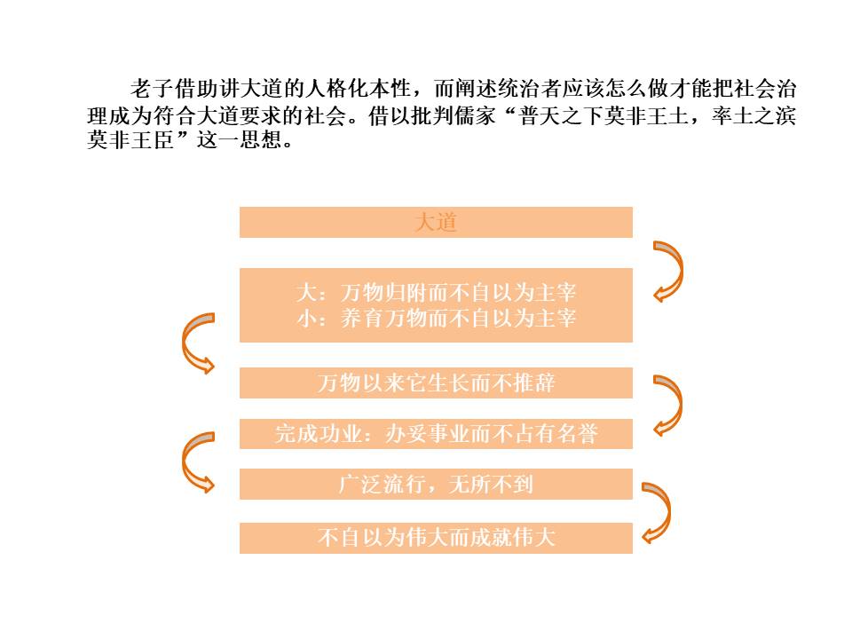 在这里,老子借助讲大道的人格化本性,而阐述统治者应该怎么做才能把社会治理成为符合大道要求的社会。借以批判儒家“普天之下莫非王土,率土之滨莫非王臣”这一思想。