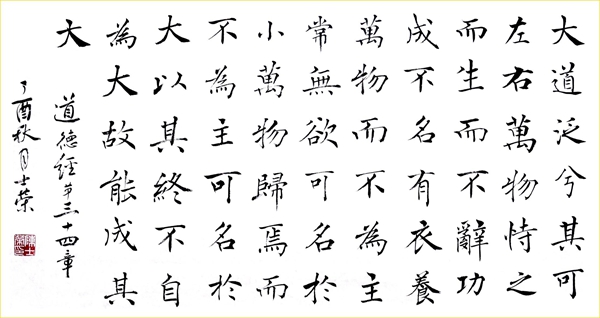 大道广泛流行,左右上下无所不到。万物依赖它生长而不推辞,完成了功业,办妥了事业,而不占有名誉。它养育万物而不自以为主,可以称它为“小”,万物归附而不自以为主宰,可以称它为“大”。正因为他不自以为伟大,所以才能成就它的伟大、完成它的伟大。