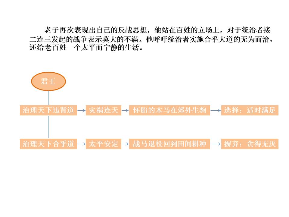 在这里,老子再次表现出自己的反战思想,他站在百姓的立场上,对于统治者接二连三发起的战争表示莫大的不满。他呼吁统治者实施合乎大道的无为而治,还给老百姓一个太平而宁静的生活。