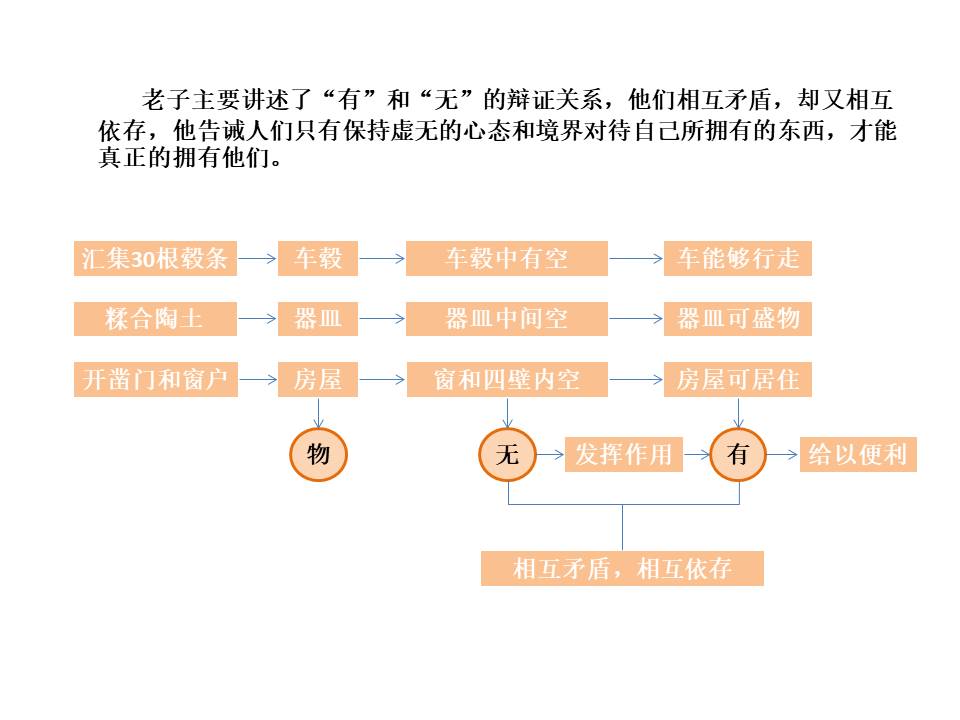 在这里,老子主要讲述了“有”和“无”的辩证关系,他们相互矛盾,却又相互依存,他告诫人们只有保持虚无的心态和境界对待自己所拥有的东西,才能真正的拥有他们。