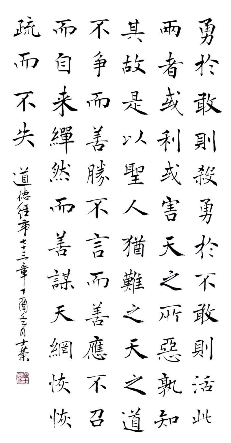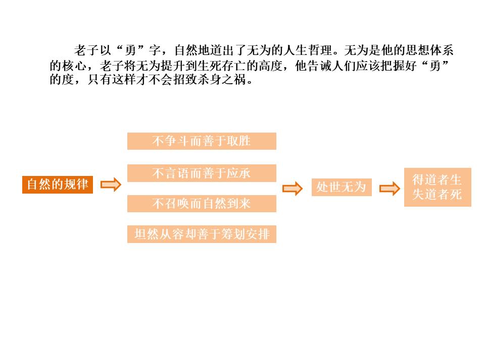 在这里,老子以“勇”字,自然地道出了无为的人生哲理。无为是他的思想体系的核心,老子将无为提升到生死存亡的高度,他告诫人们应该把握好“勇”的度,只有这样才不会招致杀身之祸。