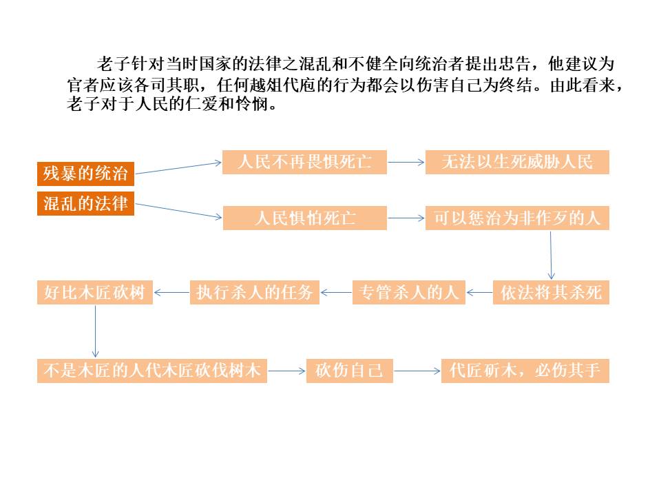 在这里,老子针对当时国家的法律之混乱和不健全向统治者提出忠告,他建议为官者应该各司其职,任何越俎代庖的行为都会以伤害自己为终结。由此看来,老子对于人民的仁爱和怜悯。
