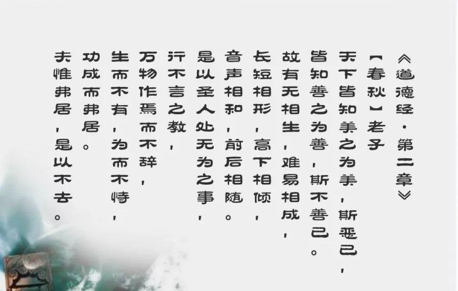 天下人都知道美之所以为美,那是由于有丑陋的存在。都知道善之所以为善,那是因为有恶的存在。所以有和无相对而生,难和易互相成就,长和短互相显现,高和下相对而存,音节与旋律相互和谐,前和后相随而有序——这是永恒的。因此圣人用无为的观点对待世事,用不发号施令的德政来教化:听任万物自然兴起而不人为地去创造,有所施为,更不加自己的主观倾向,功成业就而不据为己有。正由于没有据为己有,所以也就无所谓失去。