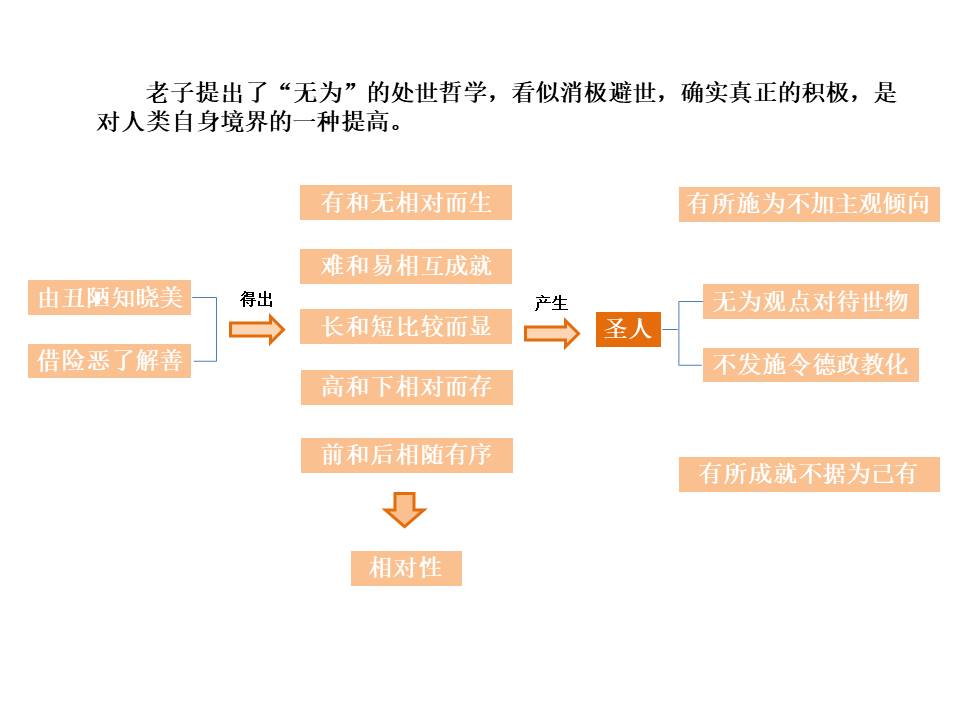万事万物其实都是相对而生的,有了相互之间的对比才能显示出他们的区别,好和坏,善和恶以及美和丑。老子提倡用圣人的无为的方式来有所施为,功成后也不据为己有,最简单的说法就是不看重无所谓,也就不会在乎失去。好比张良面对高官俸禄,最终只选择了小小的留侯,避免了开国元勋最后的不好下场。