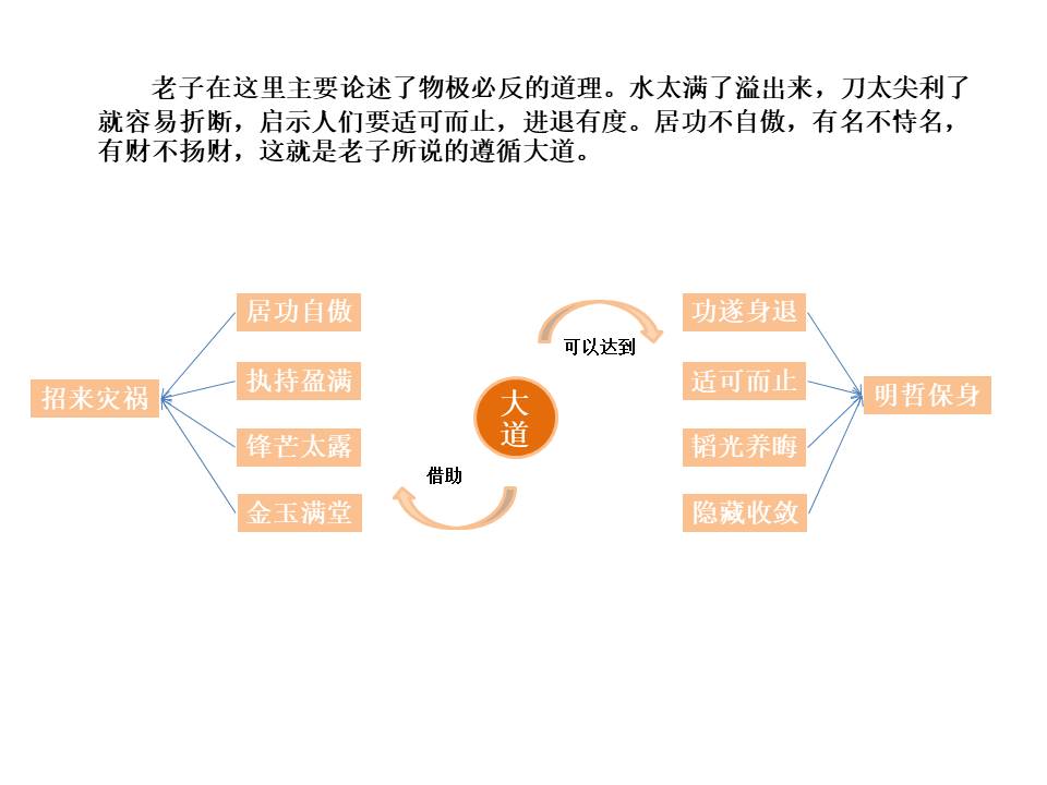 老子在这里告诫人们:物极必反,太满会溢,太尖利会断,启示人们要适可而止,进退有度。锋芒太露就会遭受嫉妒和陷害,倒不如在一定的时间功成身退,就是居功不自傲,有名不恃名,有财不扬财,这就是老子所说的遵循大道。