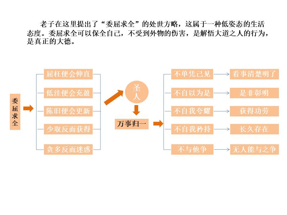 老子在这里提出了“委屈求全”的处世方略,这属于一种低姿态的生活态度。委屈求全可以保全自己,不受到外物的伤害,是解悟大道之人的行为,是真正的大德啊。