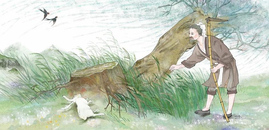 宋国有一个农民,每天在田地里劳动。有一天,这个农夫正在地里干活,突然一只野兔从草丛中窜出来。野兔因见到有人而受了惊吓。它拼命地奔跑,不料一下子撞到农夫地头的一截树根上,折断脖子死了。农夫便放下手中的农活,走过去捡起死兔子,他非常庆幸自己的好运气。晚上回到家,农夫把死兔交给妻子。妻子做了香喷喷的野兔肉,两口子有说有笑美美地吃了一顿。第二天,农夫照旧到地里干活,可是他再不像以往那么专心了。 他干一会儿就朝草丛里瞄一瞄、听一听,希望再有一只兔子窜出来撞在树桩上。就这样,他心不在焉地干了一天活,该锄的地也没锄完。直到天黑也没见到有兔子出来,他很不甘心地回家了。第三天,农夫来到地边,已完全无心锄地。他把农具放在一边,自己则坐在树桩旁边的田埂上,专门等待野兔子窜出来。可是又白白地等了一天。后来,农夫每天就这样守在树桩边,希望再捡到兔子,然而他始终没有再得到。但农田里的苗因他而枯萎了。农夫因此成了宋国人议论的笑柄。