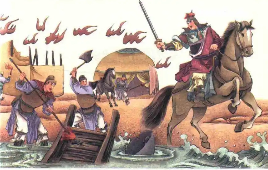 赵国被围后,楚怀王接到赵王求援的书信,派宋义为上将军,带着项羽、范增北上救赵。但是宋义胆小怕事,根本就不想到城下和秦军拼命,到达安阳的时候,便号令全军原地休息,一住就是40多天。项羽非常着急,就跑到宋义面前,并多次呼吁部队前进。宋义害怕秦军太强大,所以不动。到了第四十六天,项羽再次要求前行。宋义拍了拍桌子,愤怒地说:"你反了吗?怎么敢不听从我的命令!"项羽很生气,拔出剑来杀了他。随后,他率所有军队悉数渡黄河前去营救赵国以解巨鹿之围。楚军全部渡过漳河以后,项羽让士兵们饱饱地吃了一顿饭,每人再带三天干粮,然后传下命令:"皆沉船,破釜甑",意思是说把渡河的船(古代称舟)凿穿沉入河里,把做饭用的锅(古代称釜)砸个粉碎,把附近的房屋放把火统统烧毁。这就叫破釜沉舟。项羽用这办法来表示他有进无退、一定要夺取胜利的决心。就这样,没有退路的楚军战士都以一当十,十分英勇,最终以少胜多,赢得了这场战役的胜利,杀死了秦将苏角,俘虏了王离。
