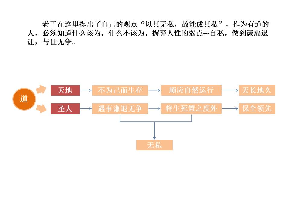 老子在这里提出了自己的观点“以其无私,故能成其私”,作为有道的人,必须知道什么该为,什么不该为,摒弃人性的弱点---自私,做到谦虚退让,与世无争。