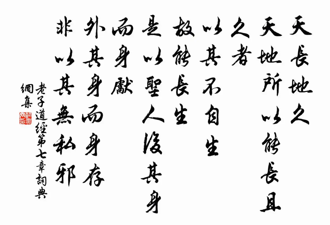 天地是长久存在的。天地之所以能够长生而且永久存在,是因为它们不是为了自己而生存,是顺应着自然在运行,所以能够长久生存。因此有道的圣人在遇事时谦退无争,反而能在众人之中领衔,;把自己的生死置之度外,结果反而能够保全自身。这不正因为他不自私吗?所以反倒成就了他自己。