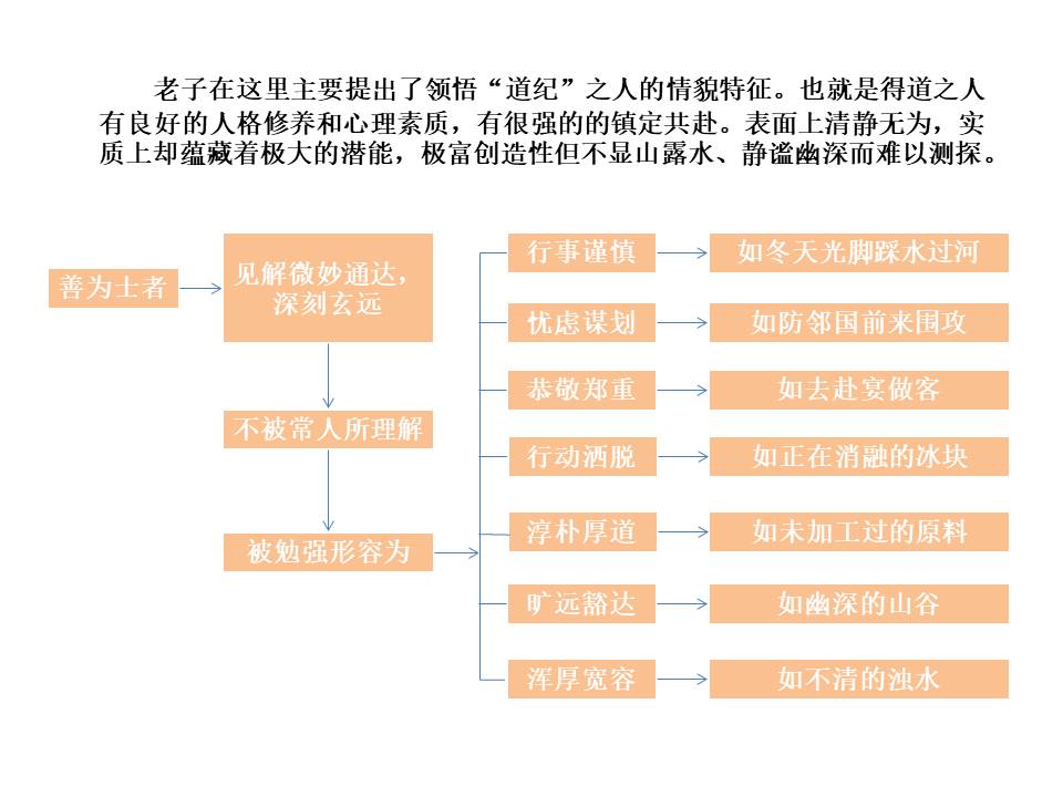 老子在这里主要提出了领悟“道纪”之人的情貌特征。也就是得道之人有良好的人格修养和心理素质,有很强的的镇定共赴。表面上清静无为,实质上却蕴藏着极大的潜能,极富创造性但不显山露水、静谧幽深而难以测探。