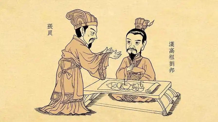 西汉初年,天下已定,汉高祖刘邦在洛阳南宫举行盛大的宴会,喝了几轮酒后,他向群臣提出一个问题:”我为什么会取得胜利?而项羽为什么会失败?”高起、王陵认为高祖派有才能的人攻占城池与战略要地,给立大功的人加官奉爵,所以能成大事业。而项羽恰恰相反,有人不用,立功不授奖,贤人遭疑惑,所以他才失败。汉高祖刘邦听了,认为他们说得有道理,但是最重要的取胜原因是能用人。他称赞张良说:“夫运筹帷幄之中,决胜千里之外,吾不如子房(古人有名,有字,子房为张良的字)。”意思是说,张良坐在军帐中运用计谋,就能决定千里之外战斗的胜利。这说明张良心计多,善用脑,善用兵。后来人们就用“运筹帷幄”表示善于策划用兵,指挥战争。