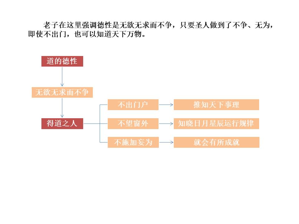 老子在这里强调德性是无欲无求而不争,只要圣人做到了不争、无为,即使不出门,也可以知道天下万物。