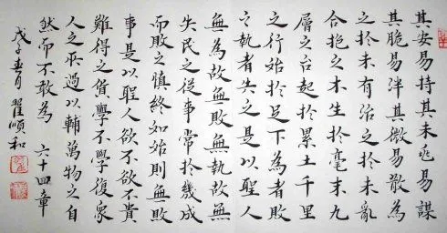 局面安定时容易保持和维护,事情没有出现迹象时更容易筹谋策划;事物脆弱时容易消解;事物细微时容易散失;处理事情要在它尚未发生以前就处理妥当;治理国政,要在祸乱没有产生以前就早做准备。合抱的大树,生长于细小的根芽;九层的高台,筑起于每一框框泥土;千里的远行,是从脚下第一步开始走出来的。主观妄为的将会招致失败,太过执着的就容易失去。因此圣人不恣意妄为所以也不会招致失败,无所执着所以也不会失去。人们做事情,总是在快要成功的时候失败,所以当事情快要完成的时候,也要像开始时那样慎重,就没有办不成的事情。因此,有道的圣人追求人所不追求的,不稀罕难以得到的货物,学习别人所不学习的,补救众人所经常犯的过错。这样遵循万物的自然本性而不会妄加干预。