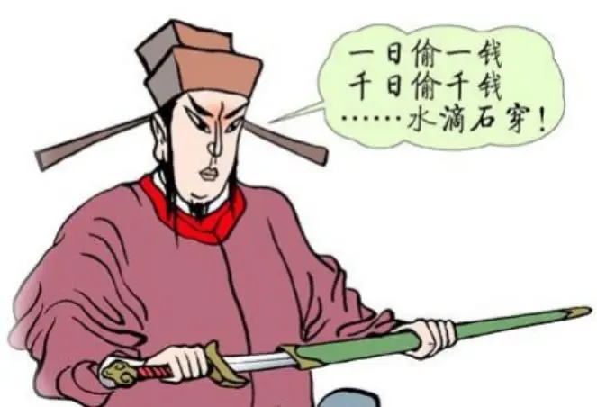 宋朝时,有个叫张乖崖的人,在崇阳县担任县令。当时,崇阳县社会风气很差,盗窃成风,甚至连县衙的钱库也经常发生钱、物失窃的事件。张乖崖决心好好刹一刹这股歪风。有一天,他终于找到了一个机会。这天,他在衙门周围巡行,看到一个管理县行钱库的小吏慌慌张张地从钱库中走出来,张乖崖急忙把库吏喊住:“你这么慌慌张张干什么?"“没什么。”那库吏回答说。张乖崖联想到钱库经常失窃,判断库吏可能监守自盗。便让随从对库吏进行搜查。结果,在库吏的头巾里搜到一枚铜钱。张乖崖把库吏押回大堂审讯,问他一共从钱库偷了多少钱,库吏不承认另外偷过钱,张乖崖便下令拷打。库吏不服,怒冲冲地道:“偷了一枚铜钱有什么了不起,你竟这样拷打我?你也只能打我罢了,难道你还能杀我?”张乖崖看到库吏竟敢这样顶撞自己,不由得十分愤怒,他拿起朱笔,宣判说:“一日一钱,千日千钱,绳锯木断,水滴石穿。”意思是说,一天偷盗一枚铜钱,一千天就偷了一千枚铜钱。用绳子不停地锯木头,木头就会被锯断;水滴不停地滴,能把石头滴穿。判决完毕,张乖崖吩咐衙役把库吏押到刑场,斩首示众。从此以后,崇阳县的偷盗风被刹住,社会风气也大大地好转。