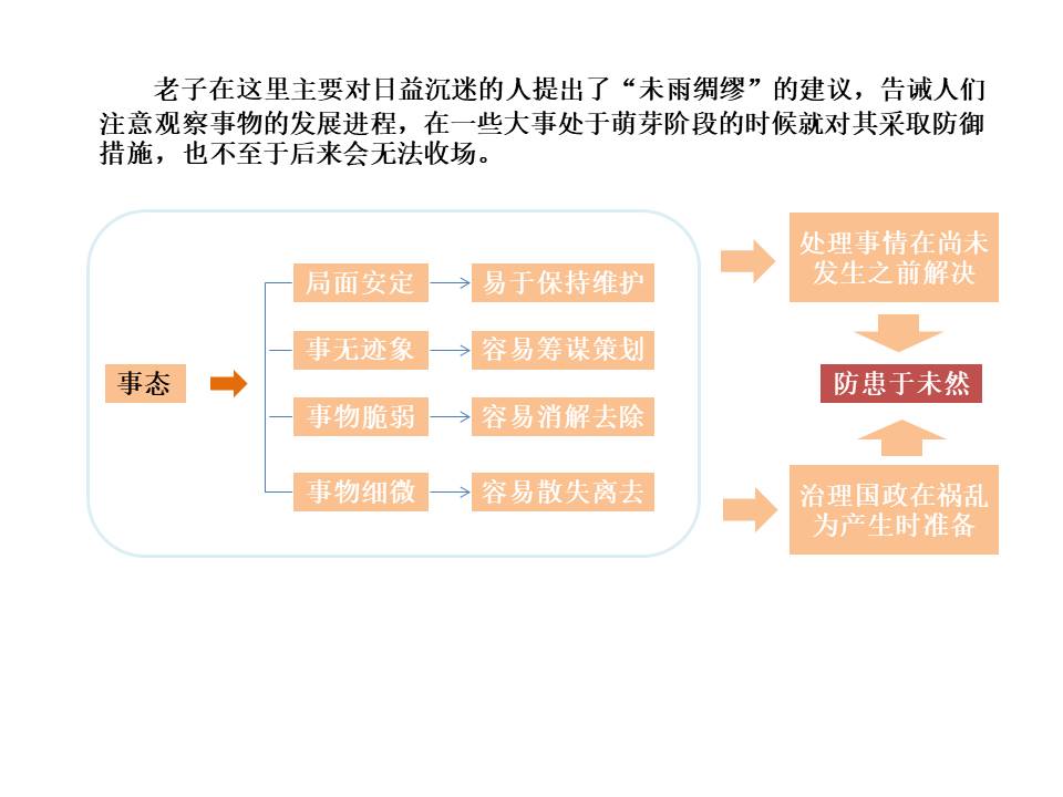 老子在这里主要对日益沉迷的人提出了“未雨绸缪”的建议,告诫人们注意观察事物的发展进程,在一些大事处于萌芽阶段的时候就对其采取防御措施,也不至于后来会无法收场。